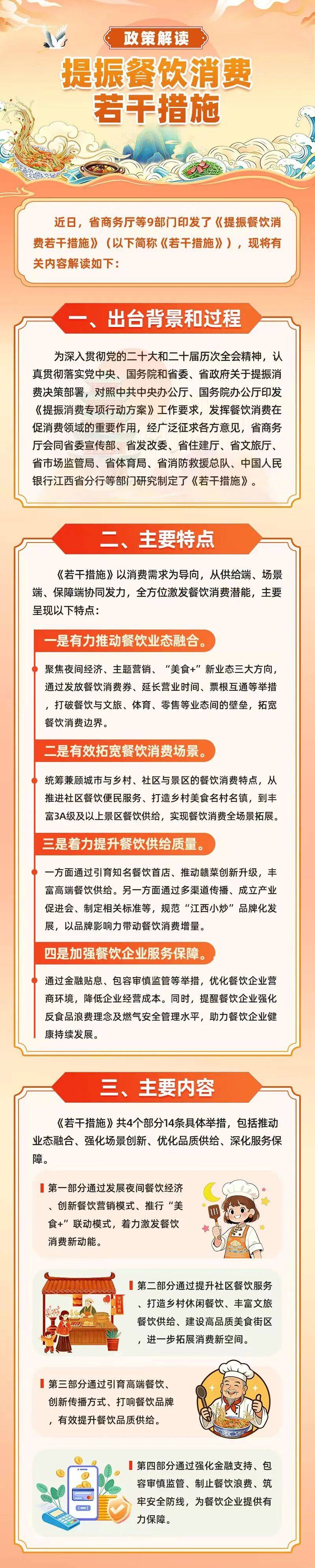 正在鞭策业态融合方面,《若干办法》提出,鼎力成长夜间餐饮经济,支撑耽误餐饮运营时间,营制“越夜越甘旨”的消费空气,并激励各地结合平台企业发放消费券;立异餐饮从题营销,持续打制江西小炒美食市集,通过“凭票享美食”、餐饮消费抵扣景区门票等行动,实现文旅、体育取餐饮消费深度融合。